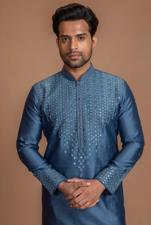 A stunning hand-embroidered kurta set elegantly paired with a white churidar for a sophisticated and graceful attire. Category - Kurta Set