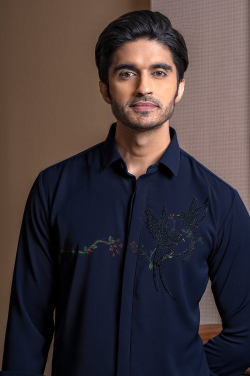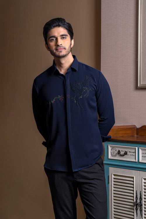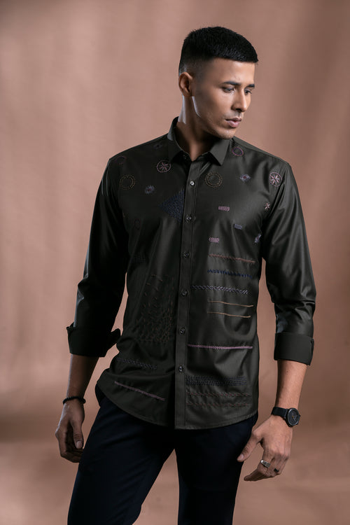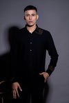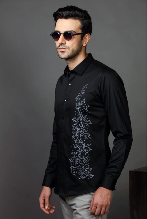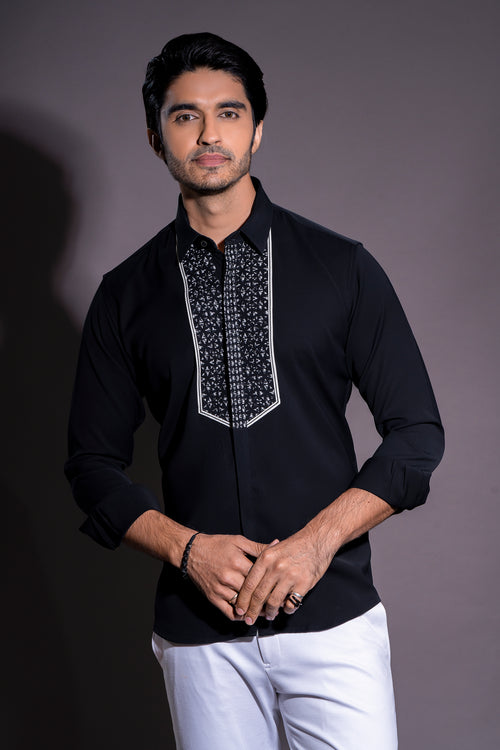 Black Polyester Shirt with Hand Embroidery – Ideal for smart casual and formal wear, featuring durable black embroidery that pairs well with monochrome or neutral layers....