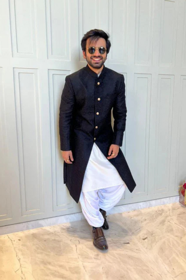 Exude royal charm with this elegant Nawabi Set, featuring a black textured bandhgala-style sherwani with gold buttons, paired effortlessly with a classic white kurta and Patiala...