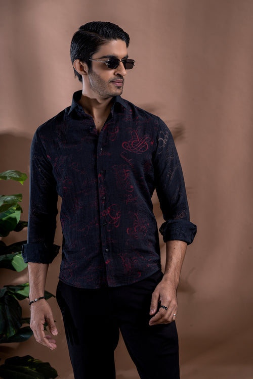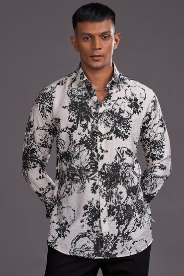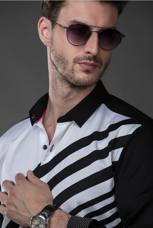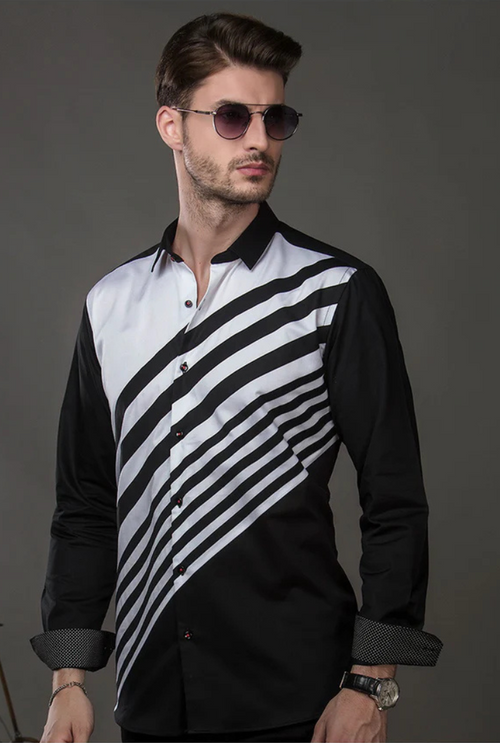 Monochrome Muse, a cotton printed black and white shirt, offering cool comfort and versatility for casual meetings or rooftop events, designed for confidence and effortless style....