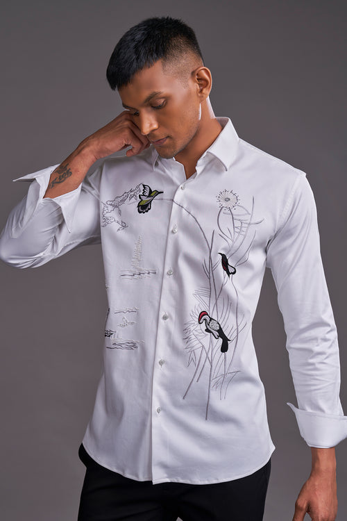 Hand-Painted Leaves and Hand-Embroidered Birds Shirt – A wearable work of art blending elegance and artistry, perfect for creative and social occasions. Fabric - Cotton