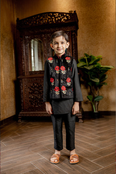 BLACK BUNDI KURTA SET WITH RED ROSE EMBROIDERY