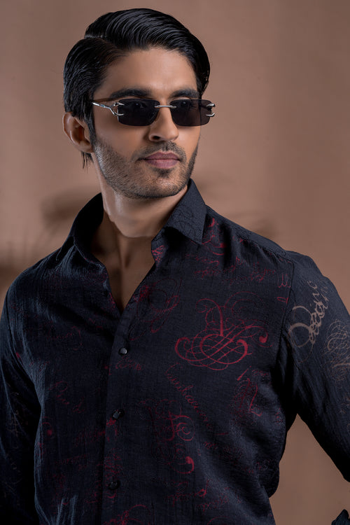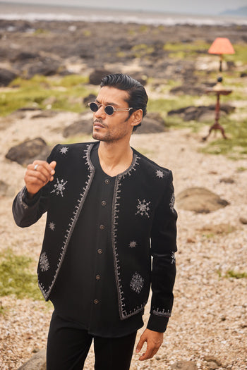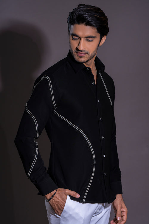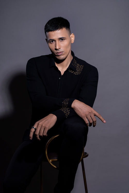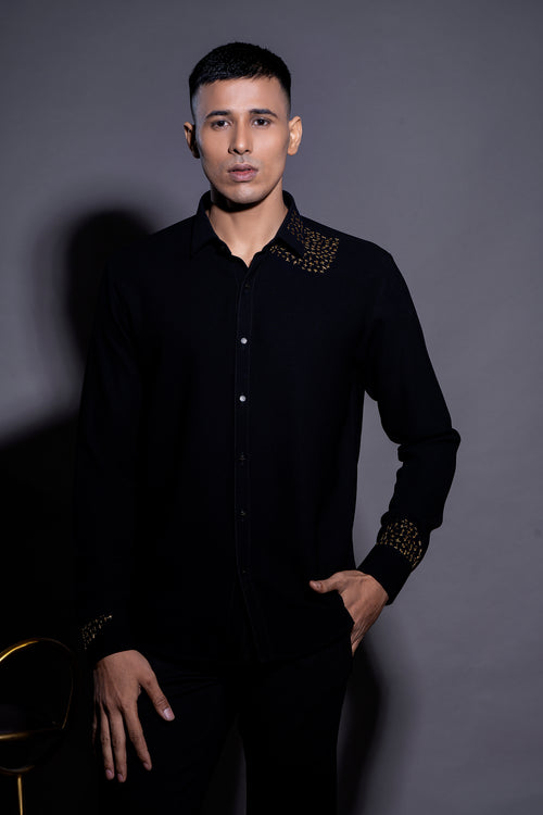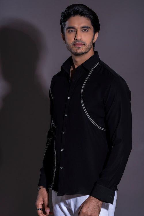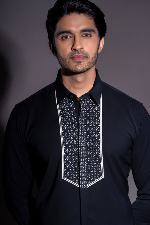 Hand-Beaded Black Polyester Shirt – Features abstract embroidery inspired by modern art, crafted on ultra-soft, non-shrink polyester for a sleek, statement look. Fabric - Cotton