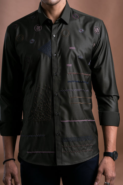 Olive Green Tetra Rayon Shirt with Hand-Embroidered Abstract Motif – Lightweight and breathable with a minimalist silhouette and artistic detail for casual, creative wear. Fabric -...