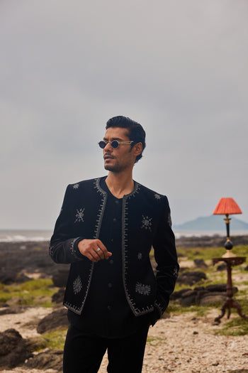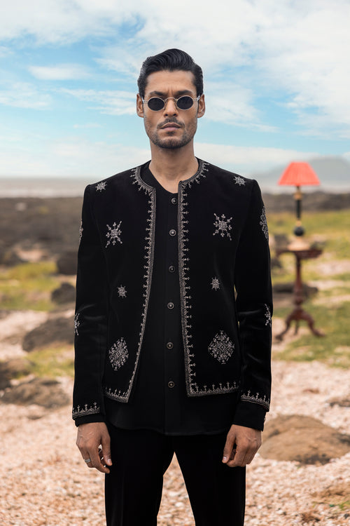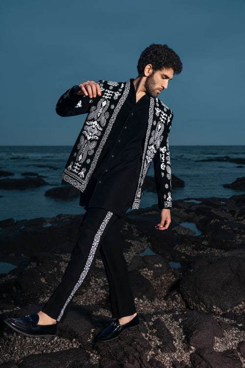 Black colour short-length open-style indo-western with delicate metal hand embroidery. It is paired with a round neck front open shirt and trousers.