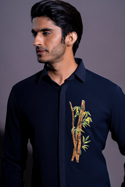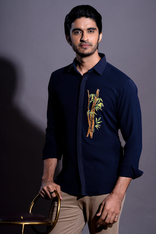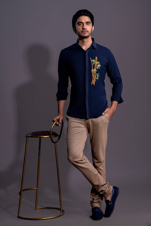 Hand-Embroidered Polyester Shirt – Features delicate bamboo stick embroidery symbolizing resilience, crafted on breathable, lightweight fabric for all-day comfort. Fabric - Cotton