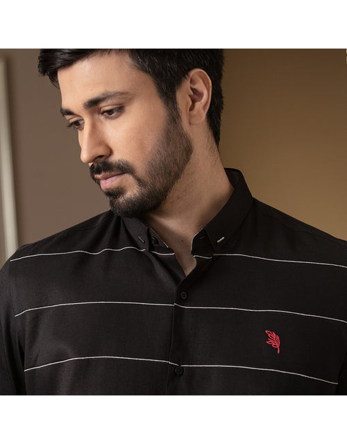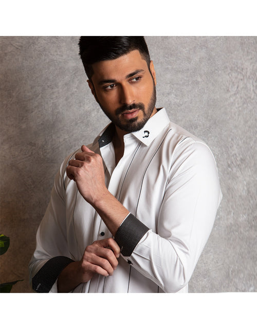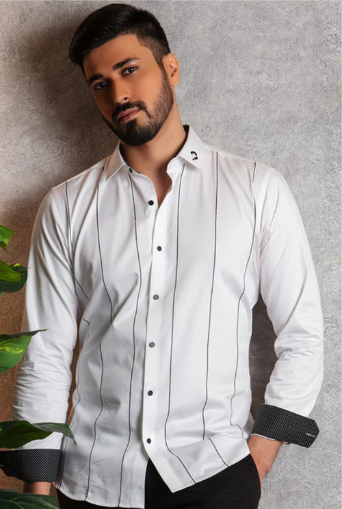 Cotton Shirt with Laser Cut Embroidered Lines – Features cut-out embroidery resembling suspenders on breathable, lightweight 100% cotton for all-day comfort. Fabric - Cotton