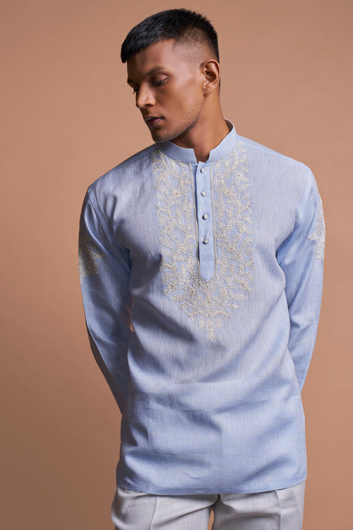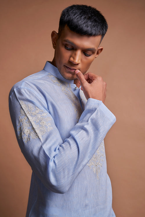 Blue linen kurta shirt with advanced hand embroidery, offering day-to-day comfort and style, perfect for festive, casual, or semi-formal events when paired with skinny jeans or...