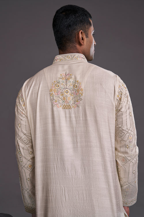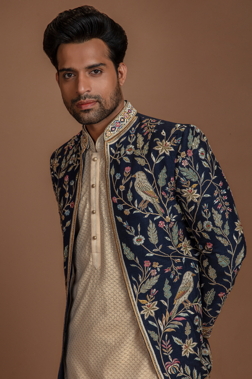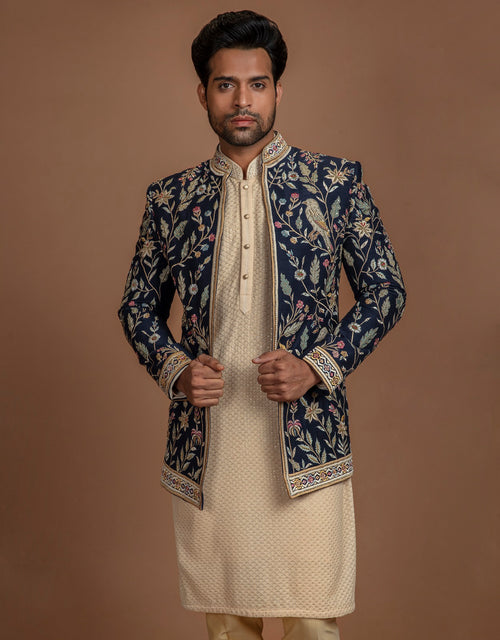 A silk short jacket embellished with vibrant multi-color embroidery, perfectly paired with a kurta and trousers ensemble, for a chic and fashionable look. Category - Indo-Western
