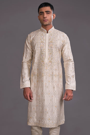 A stylish kurta featuring intricate geometric embroidery, perfect for a modern ethnic look. Ideal for casual or festive occasions. Category - Kurta