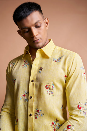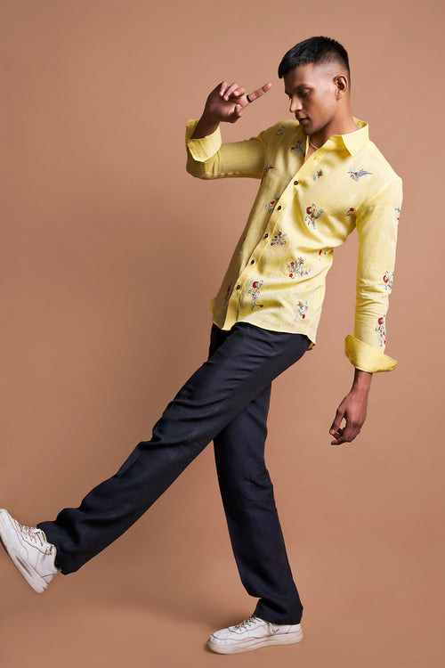 Hand-Painted Linen Shirt – Delicate Yellow Floral Design crafted by Indian artisans with soulful brushstrokes. Fabric - Linen