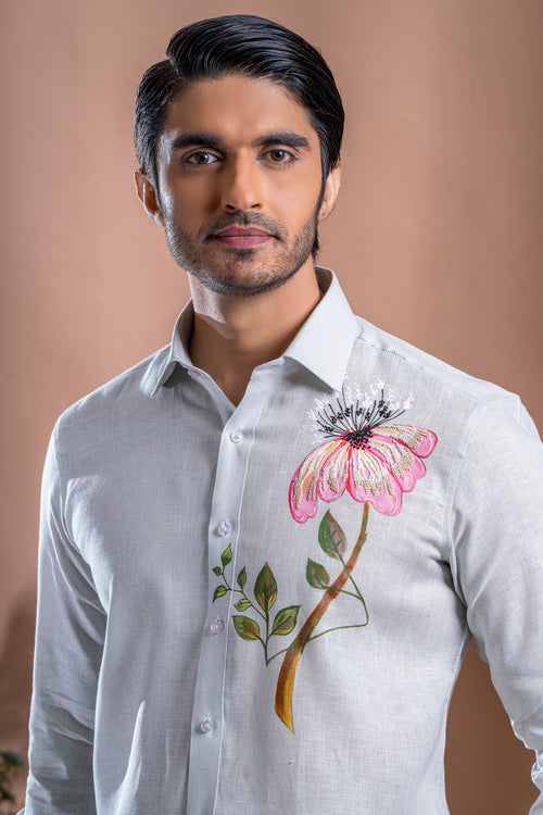 Hand-Painted and Embroidered Linen Shirt – Crafted from 100% linen with silver floral artwork and delicate embroidery for bold, artistic elegance. Fabric - Linen