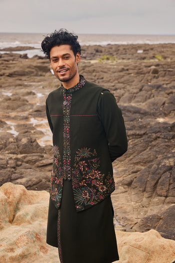 Forest green Bundi set with floral embroidery, apt for Mehendi functions. The Bundi is paired with a cut-style kurta and pants.