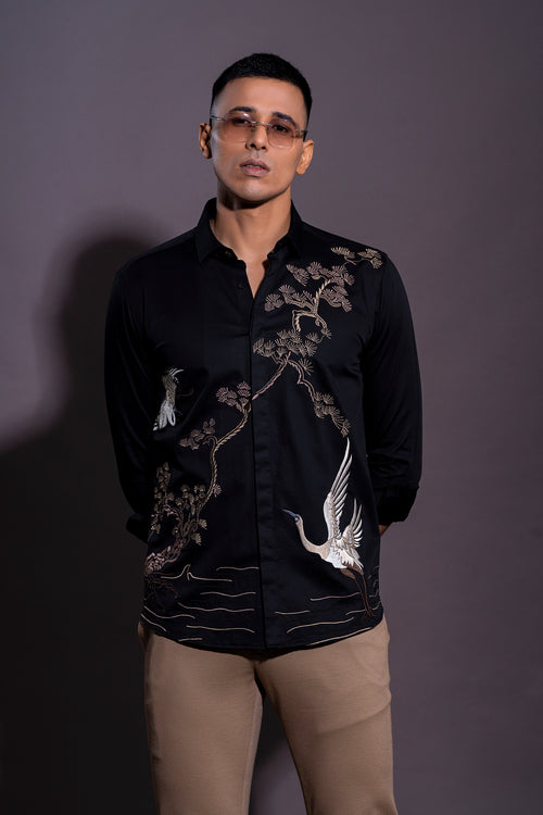 Black Cotton Shirt with Flying Swan Embroidery – Crafted by artisans to symbolize elegance and freedom on lightweight, comfortable fabric. Fabric - Cotton