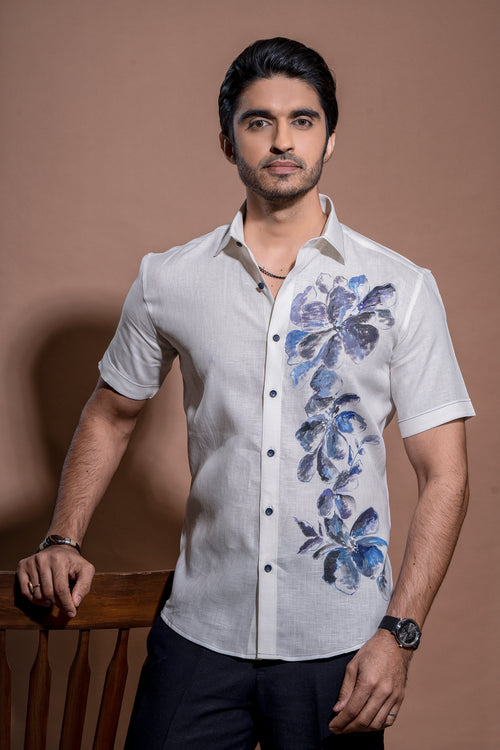 Premium linen half sleeves hand-painted blue floral shirt accented by fine hand embroidery. It ensures breathable comfort throughout the year. Fabric - Linen