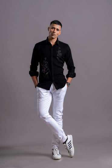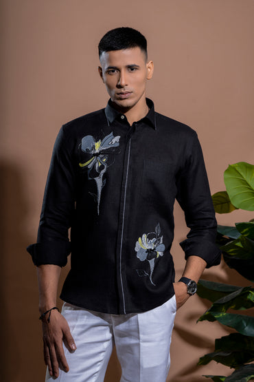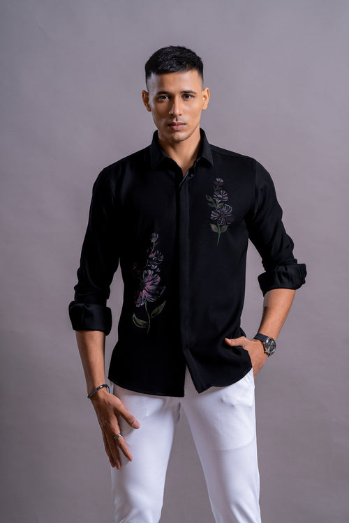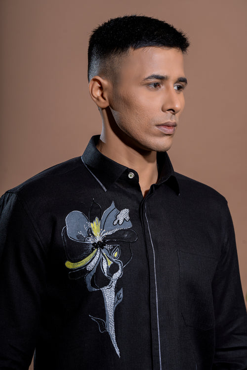 Floral Panel Black Cotton Shirt, merging modern tailoring with floral charm, perfect for festive gatherings or semi-formal occasions, offering comfort and style. Fabric - Cotton
