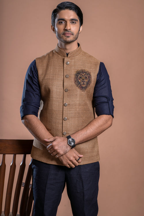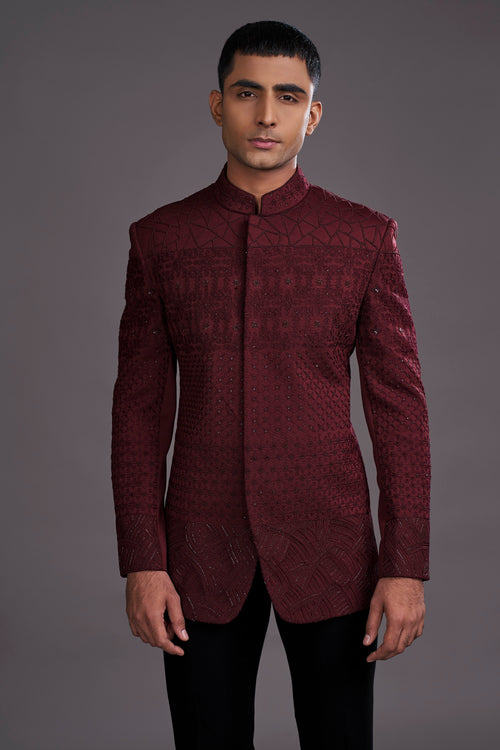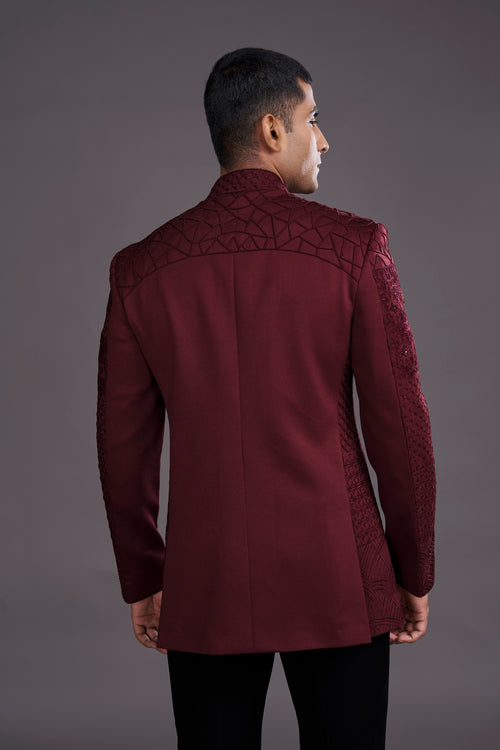 Like wine spilled on velvet earth, maroon threads intertwine in geometric verse. Hand-embroidered lines that dance with ancient rhythm and grace. Category - Bandhgala