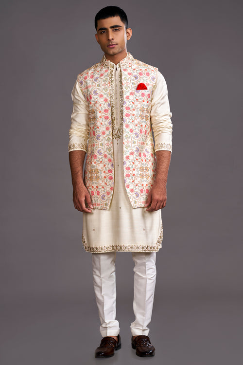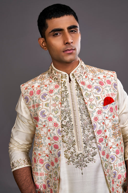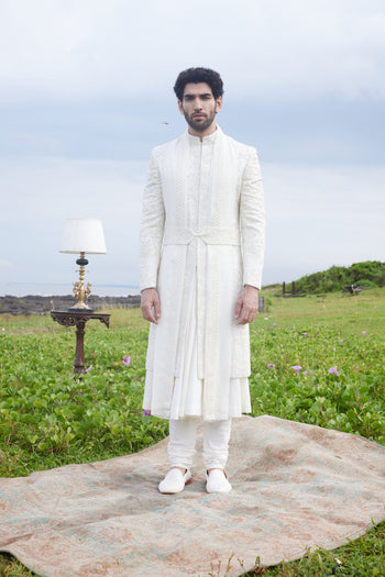 Light ivory colour organza fabric sherwani with all-over intricate hand embroidery. It is paired with a flared Anarkali kurta, churidar, and embroidered dupatta.