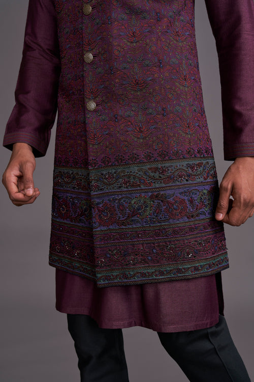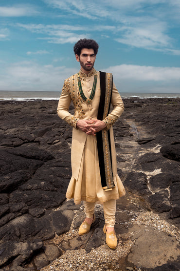 Light beige colour Matka silk fabric sherwani with placement zardosi hand embroidery. It is paired with a flared Anarkali Banarasi silk kurta, churidar, and contrast velvet...