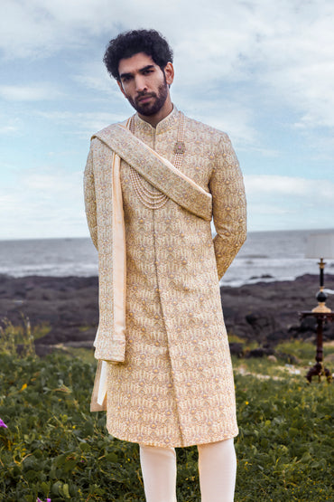 Light gold colour silk fabric sherwani with all-over intricate thread and zardosi hand embroidery. It is paired with a cotton silk straight cut kurta, churidar, and...