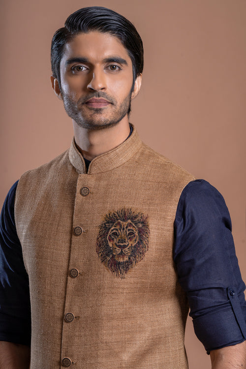 Matka silk bundi with hand painted lion motif embellished with hand embroidery Category - Only Bundi