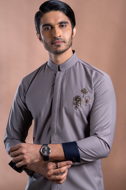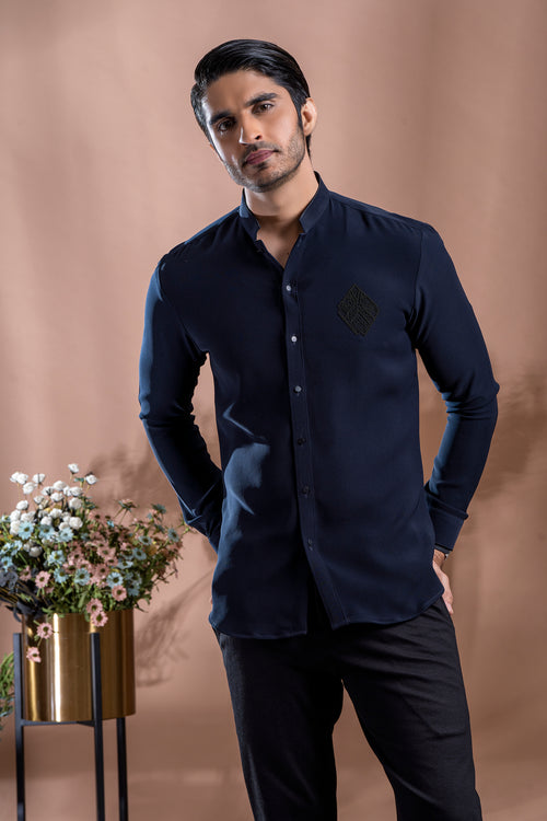 Soft Blue Polyester Shirt with Mandarin Collar – Features delicate hand-embroidered chest motif for lightweight, modern elegance in semi-formal settings. Fabric - Cotton
