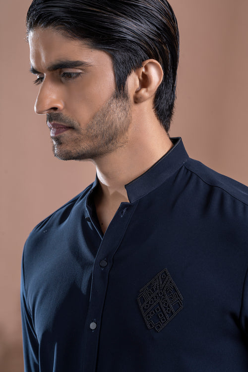 Redefine sophistication with this Classic Bandhgala, tailored in deep navy with metallic buttons and highlighted by intricate embroidery on the collar. Paired with crisp white trousers...