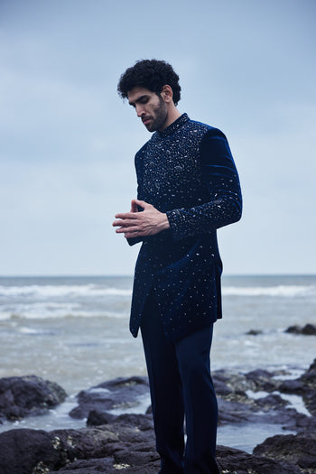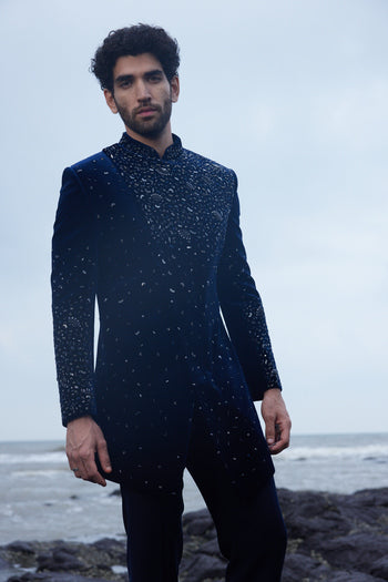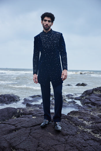 Midnight blue colour velvet indo-western with a symmetrical cut and sparkling hand embroidery. It is paired with trousers.