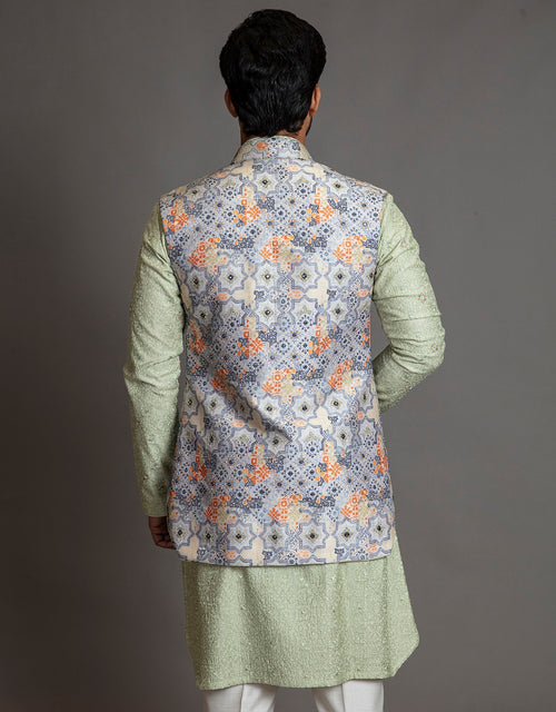 A vibrant bundi set adorned with multi-color embroidery, perfectly paired with an equally embroidered kurta set, creating a stunning and coordinated ensemble. Category - Bundi Set