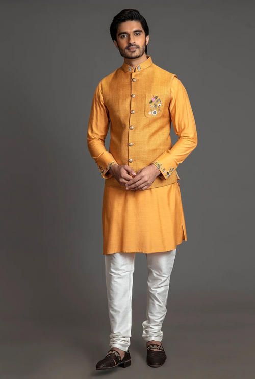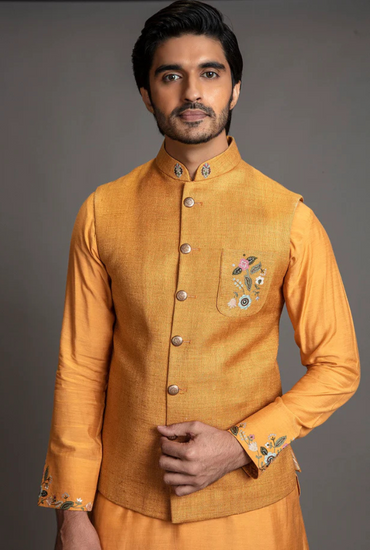 A stunning mustard bundi set featuring intricate embroidery on the pocket and a captivating motif on the neckline, creating a striking and fashionable outfit. Category -...