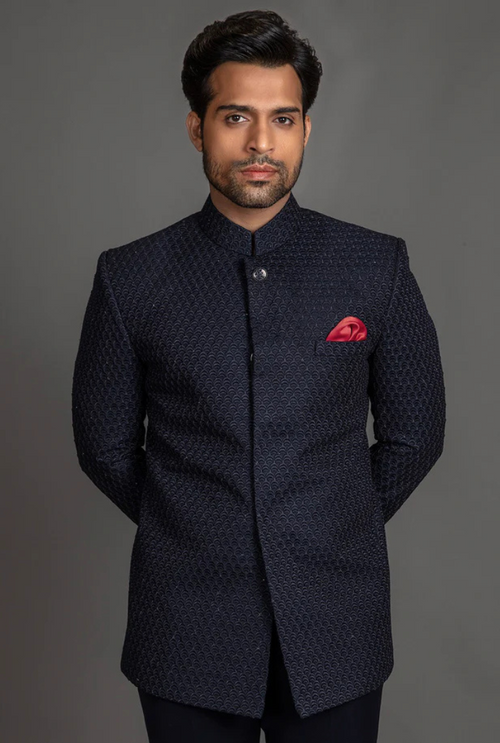 In deep blue seas of fabric, embroidery dances like stars at dusk. A touch of artful handwork transforms tradition into pure poetry. Category - Bandhgala