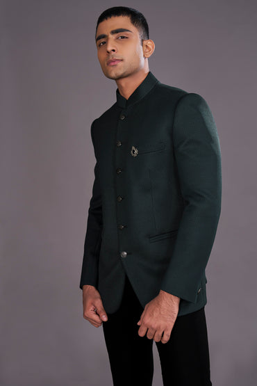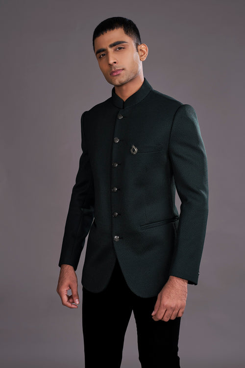 In the deep hues of the forest’s core, this bottle green bandhgala rests like a hidden grove. Classic in its beauty, it speaks of nature’s lore....