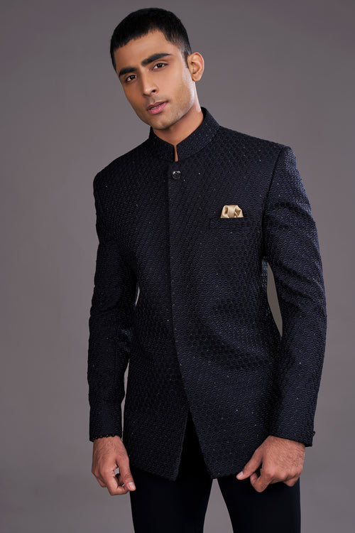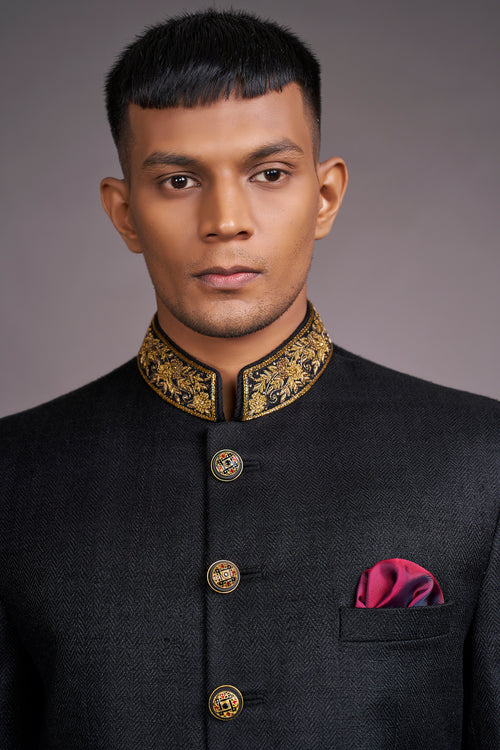 Midnight silk kissed with threads of gold, this bandhgala is a symphony of elegance. The collar, hand-embroidered, crowns you with quiet majesty. Category - Bandhgala
