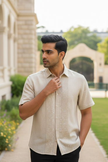 Beige linen shirt with self embroidery on placat. Fabric - Linen Function - Casual Parties and Lighter Function