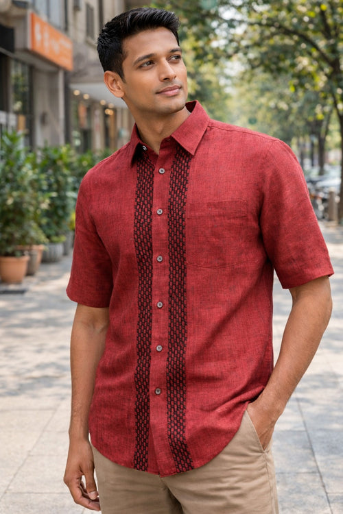 Half sleeve rust colour linen shirt with hand embroidery on placat. Fabric - Linen Function - Casual Parties and Lighter Function