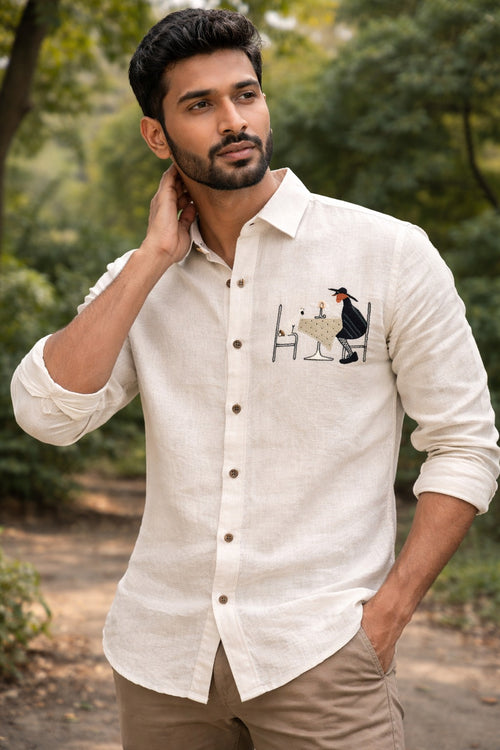 Cream linen shirt with hand embroidered party table embroidery. Fabric - Linen Function - Casual Parties