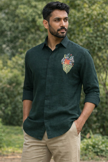 Bottle green pure linen shirt with colourful hand embroidered motif on chest. Fabric - Linen Function - Casual Parties