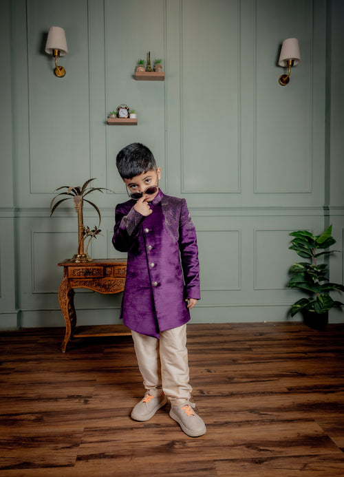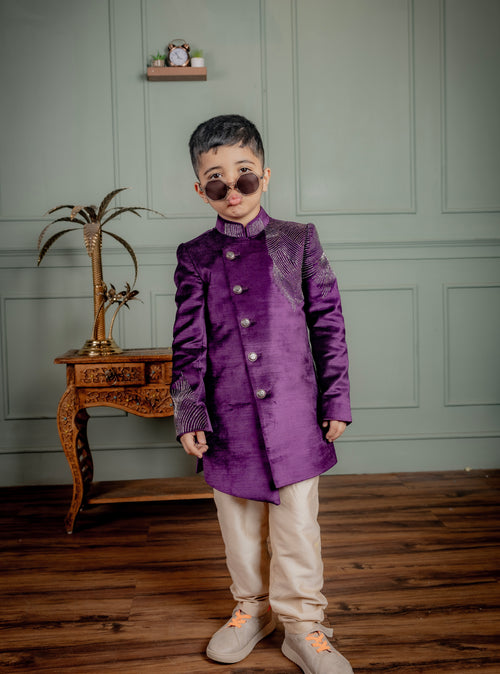 ROYALE BLUE SILK INDO WESTERN WITH CHEST MOTIF Category - INDO WESTERN