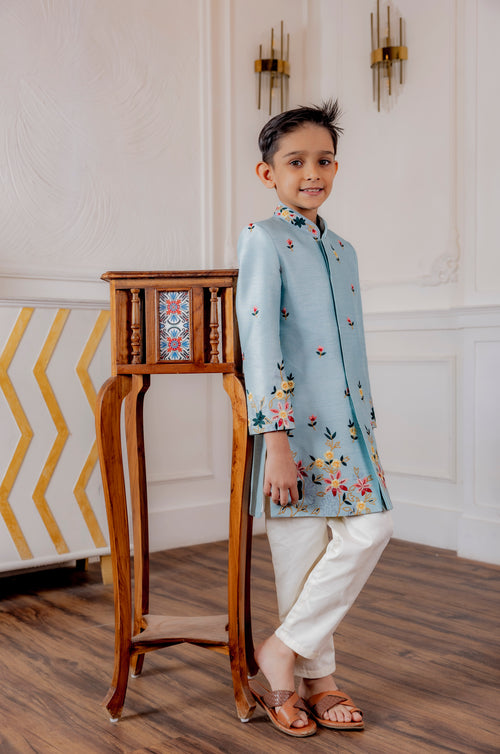 POWDER BLUE INDO WITH ALL OVER MULTICOLOUR FLOWER EMBROIDERY Category - INDO WESTERN
