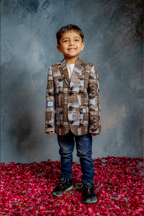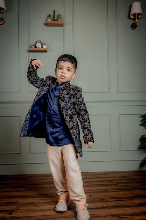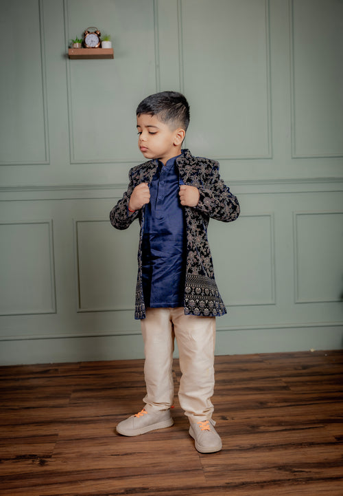 ROYALE BLUE SILK INDO WESTERN WITH CHEST MOTIF Category - INDO WESTERN