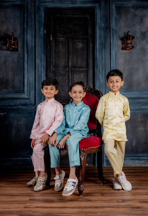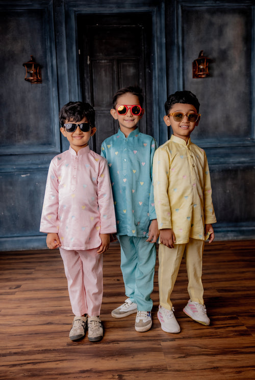 YELLOW SILK KURTA WITH ALL OVER HEART EMBROIDERY Category - KURTA SET