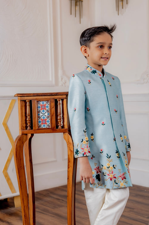 POWDER BLUE INDO WITH ALL OVER MULTICOLOUR FLOWER EMBROIDERY Category - INDO WESTERN