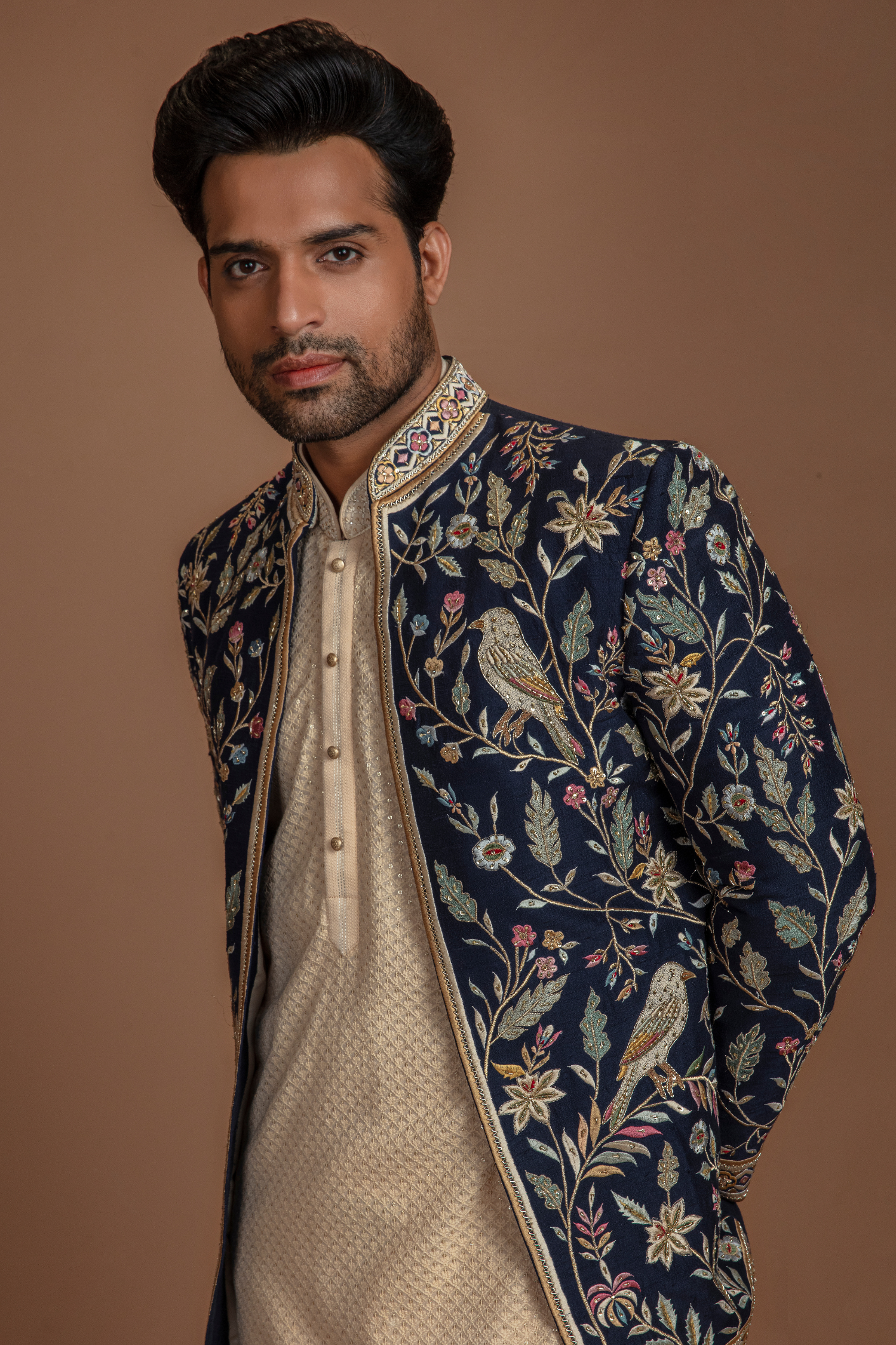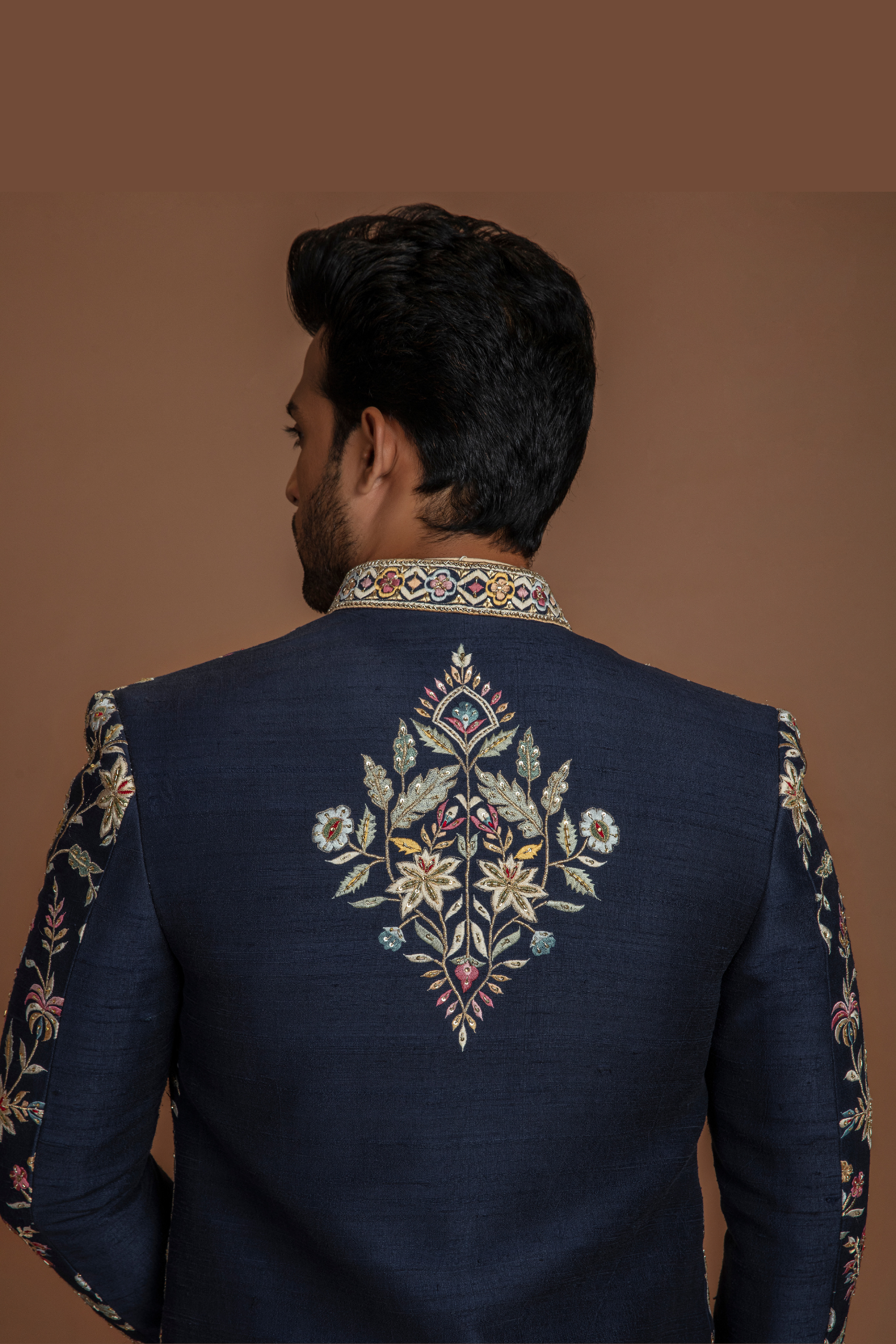 A silk short jacket embellished with vibrant multi-color embroidery, perfectly paired with a kurta and trousers ensemble, for a chic and fashionable look.