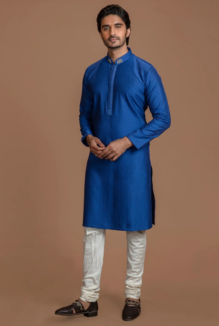 A gracefully hand-pleated classic kurta set featuring a hand-embroidered elephant motif on the collar, exuding elegance and charm.