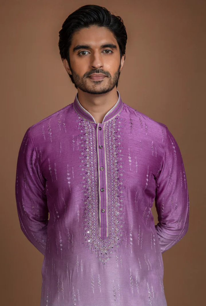 An enchanting ombre dyed self-embroidered fabric kurta set embellished with scattered hand embroidery all around, including the placket area, for a captivating and graceful appearance.