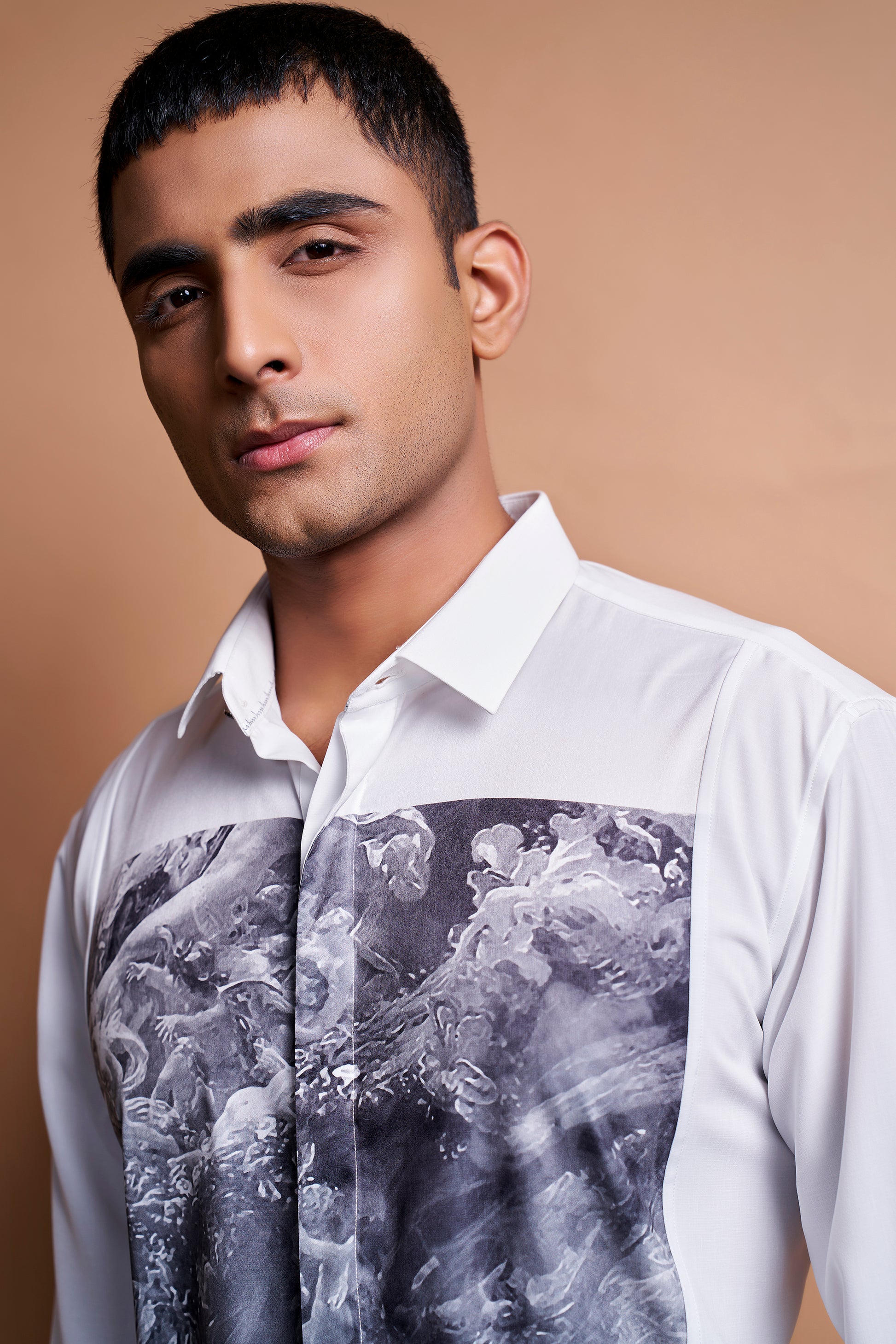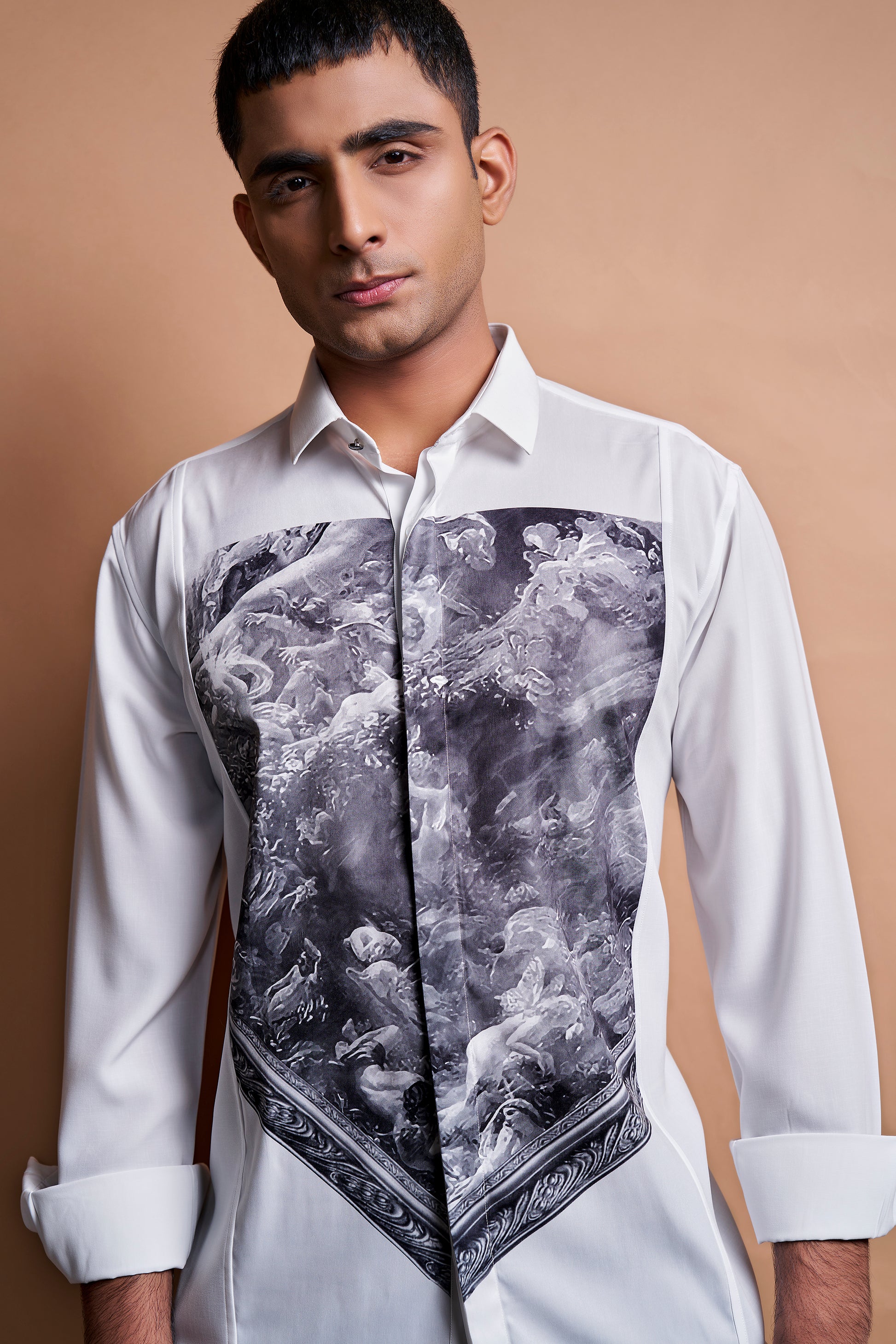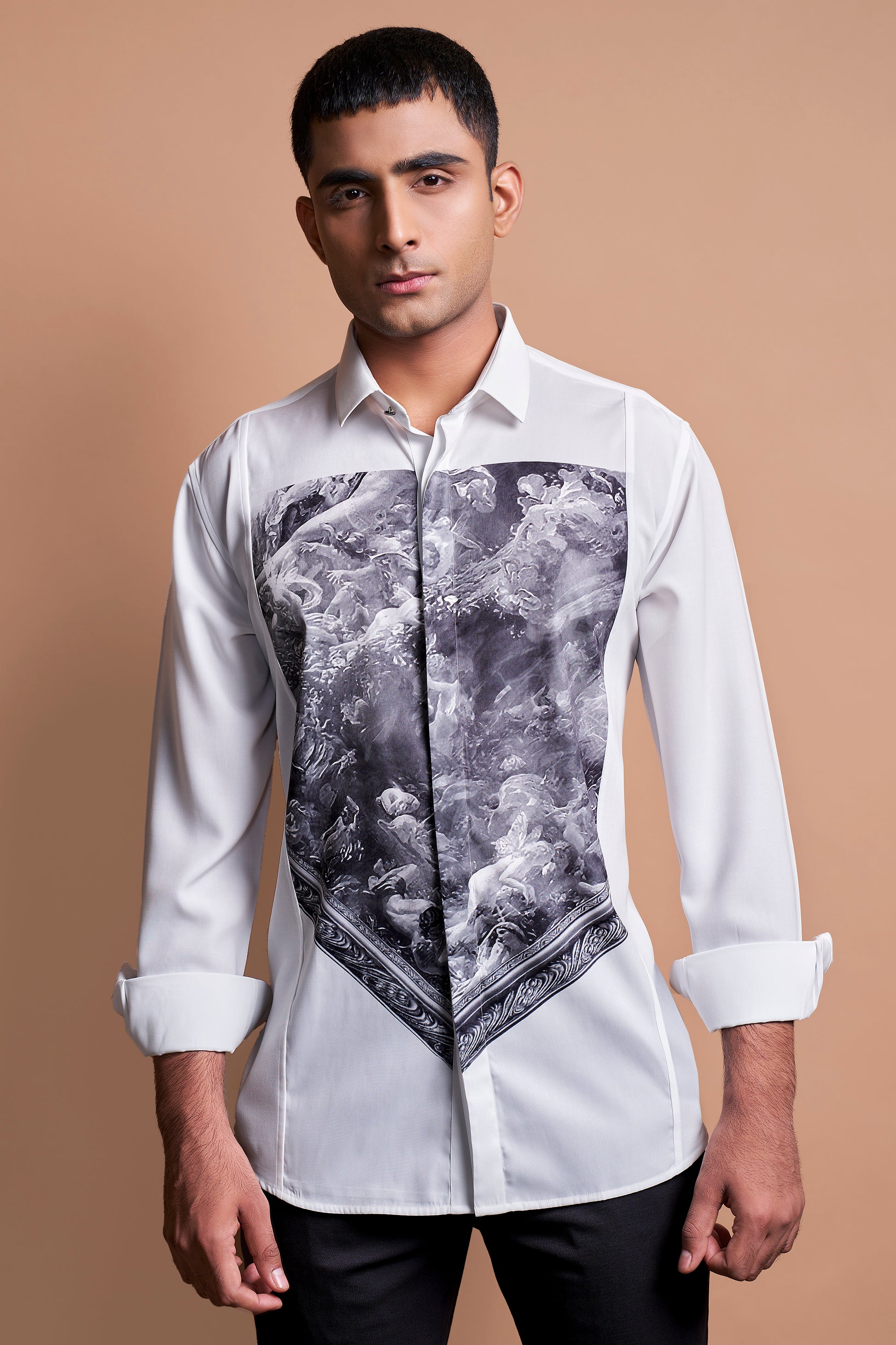 Roman Panel Shirt, crafted from cotton with a structured panel print, offering comfort and effortless style for casual trips or semi-formal occasions with standout detailing.