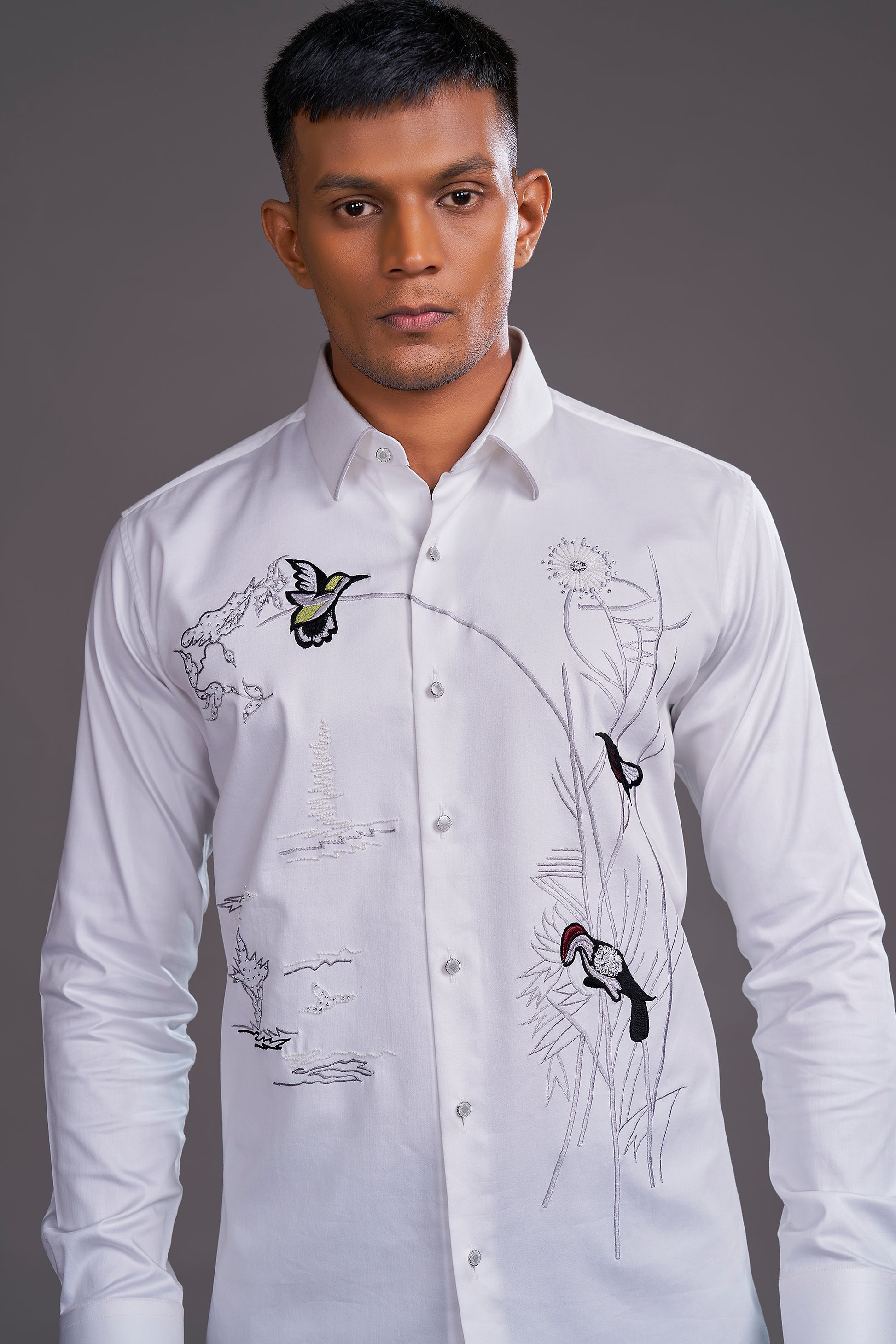 Birds of the Jungle Shirt, a cotton masterpiece with hand-painted jungle fowl and subtle embroidery, perfect for storytelling through fashion at brunches, art events, or creative workplaces.