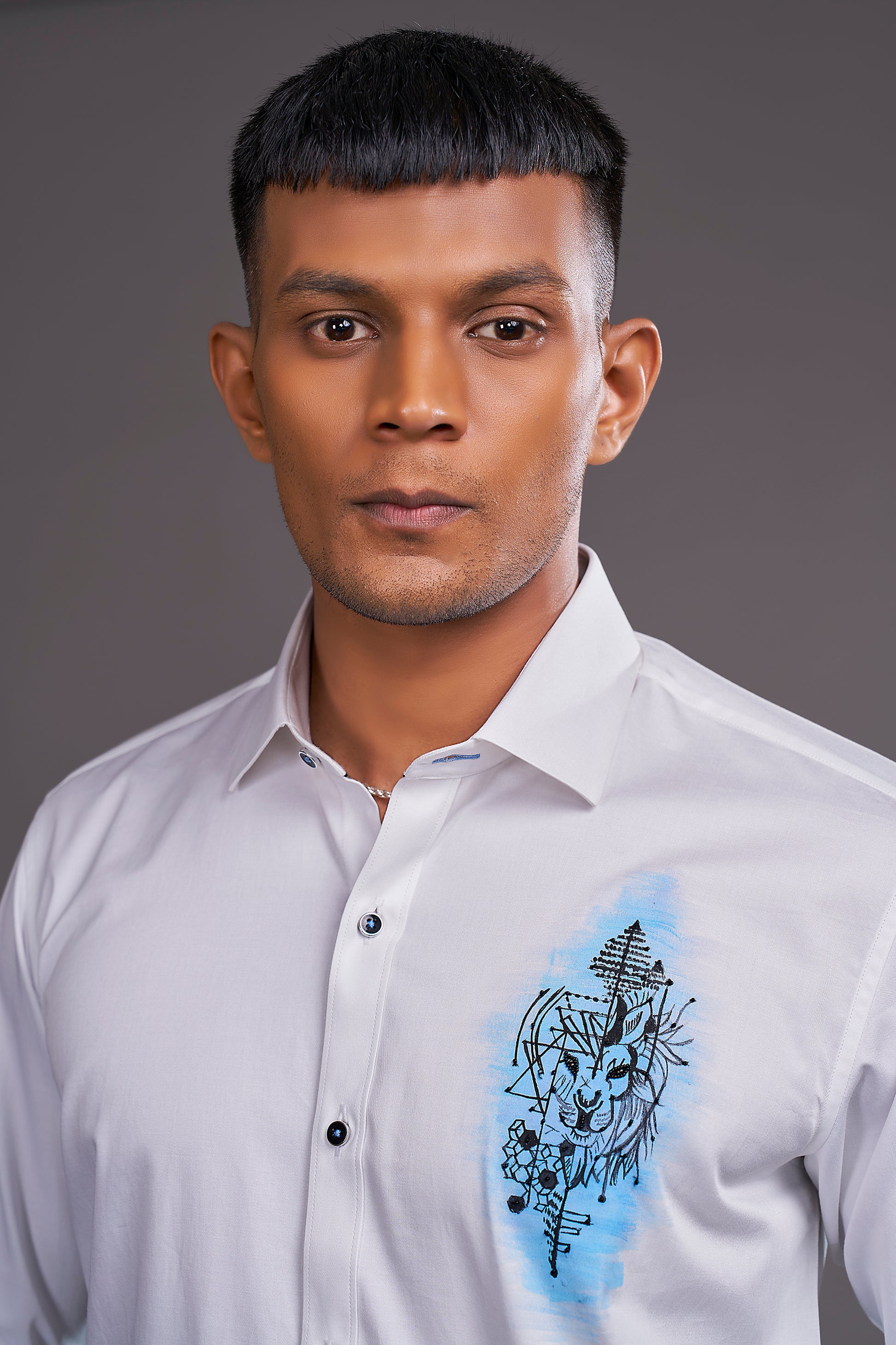 Fearless Lion Shirt, hand-painted with a dramatic lion design and detailed hand embroidery, perfect for those seeking unique, finely crafted style for events or everyday wear, paired effortlessly with trousers or denim.