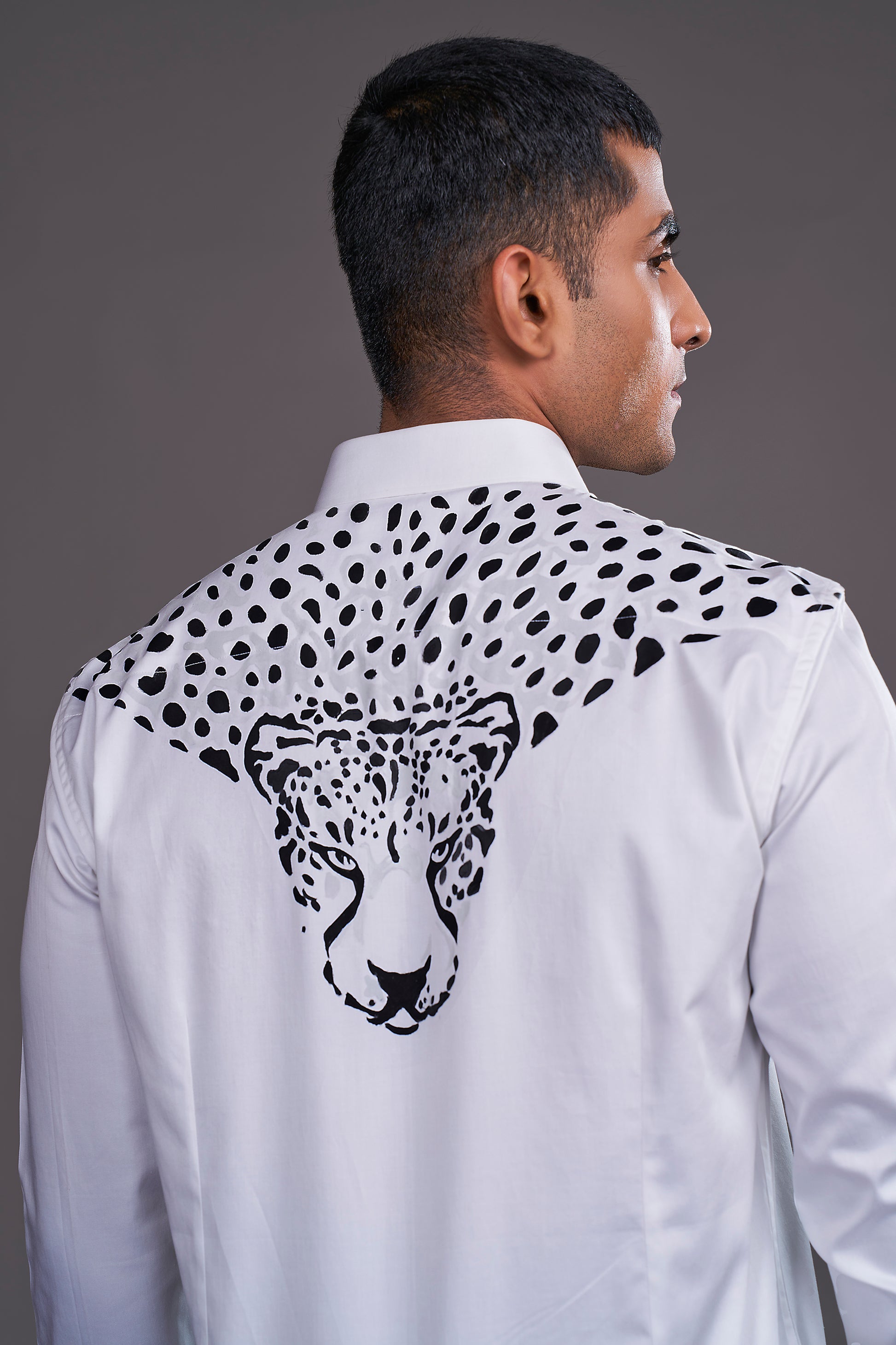 Black Leopard Shirt, a cotton piece with hand-painted leopard and detailed embroidery, blending wild power with refined craftsmanship, perfect for gallery nights or strong casual attire.