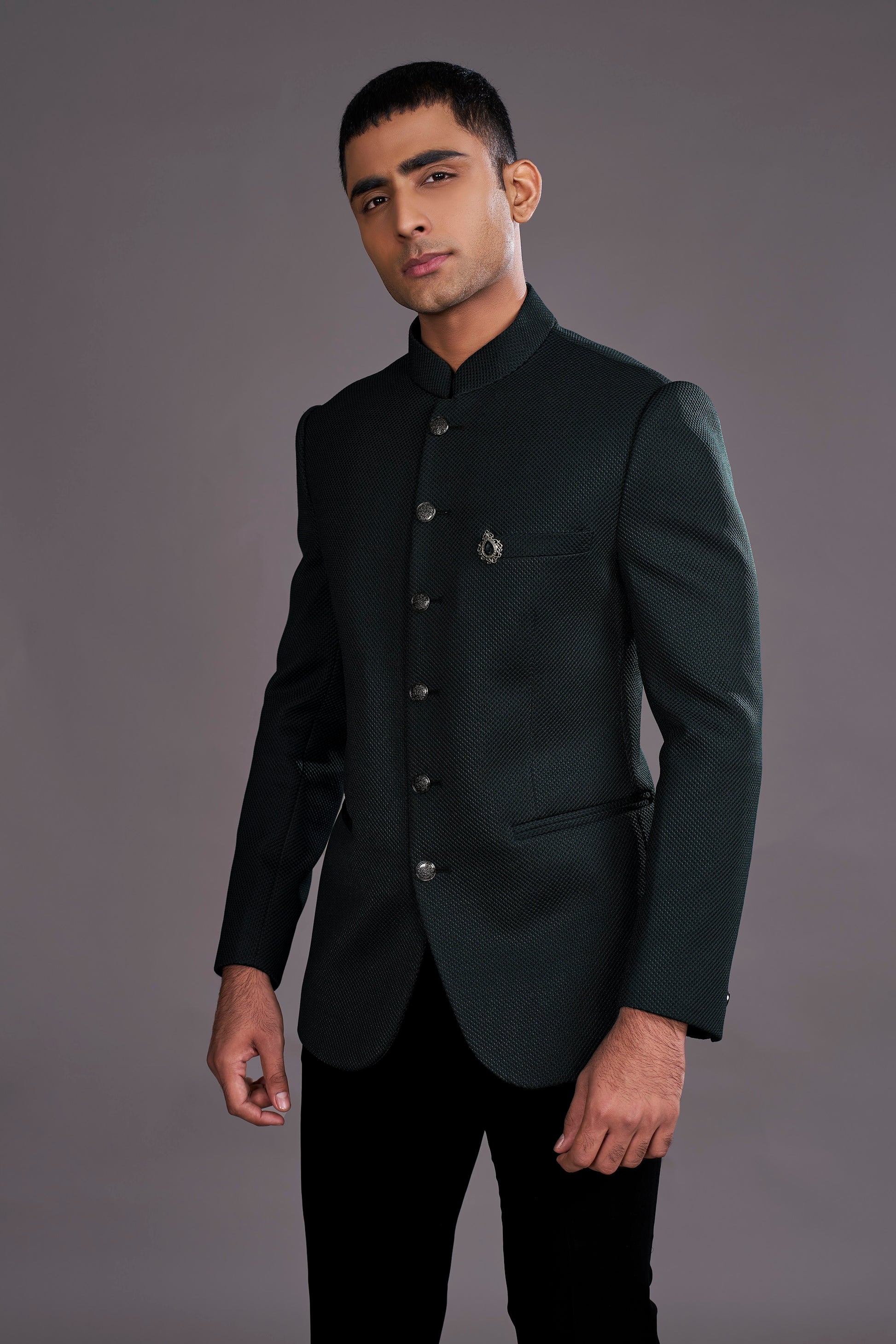 In the deep hues of the forest’s core, this bottle green bandhgala rests like a hidden grove. Classic in its beauty, it speaks of nature’s lore.